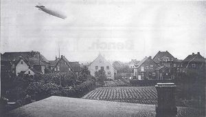 Ein Zeppelin vom Luftschiffhafen Hage über Norden. Links die Gräfin-Theda-Schule (um 1915).