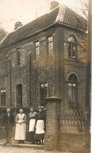 Hinrich de Jong leistete einen zehnjährigen Wehrdienst bei der Kaiserlichen Marine ab und trat am 1. April 1887 das Amt des Schuldieners, das heute in etwa mit einem Hausmeister und einem Schulassistenten vergleichbar ist, an. 1919 erlag er der spanischen Grippe, ebenso seine beiden Töchter Bernhardine (1894-1919) und Folline (1897-1919). Seine Frau Antje (* 1. August 1862-1942/1943) überlebte als einzige der Familie.[1]